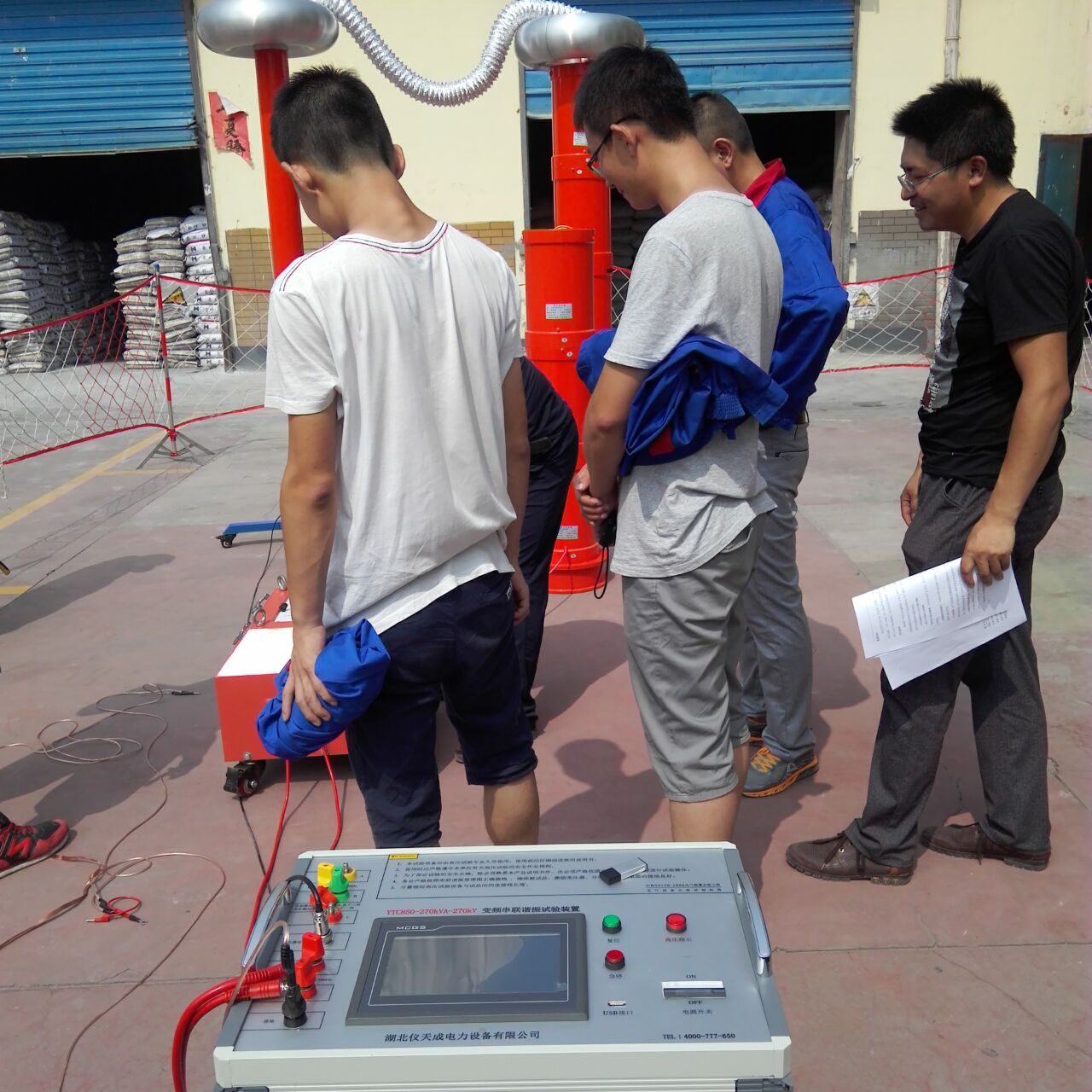 李工很快抵達(dá)現(xiàn)場,與客戶進(jìn)行面對面的交流,了解客戶的需求和想法。然后開始講解設(shè)備,并認(rèn)真講解怎樣安全操作設(shè)備。確保客戶明白了安全操作以后,李工帶領(lǐng)客戶一起做試驗——YTC850-270kVA/270kV變頻串聯(lián)諧振試驗裝置,YTCDG-1000A大電流發(fā)生器 這2套設(shè)備,其中這套變頻串聯(lián)諧振試驗裝置我公司的該設(shè)備為專利產(chǎn)品,諧振電源調(diào)頻及功率元件使用先進(jìn)的日本進(jìn)口的優(yōu)質(zhì)元器件,設(shè)計的是諧振式濾波電路,能改善輸出電壓的波形畸變,獲得很好的正弦波形,有效的防止了諧波峰值對試品的誤擊穿。變頻電源保護(hù)功能強(qiáng),穩(wěn)定性好;具備具備全自動(自動調(diào)諧、自動升壓)、全手動(手動調(diào)諧、手動升壓)以及半自動(自動調(diào)諧、手動升壓及手動調(diào)諧、自動升壓)的多種工作模式,可任意切換使用;操作方便。