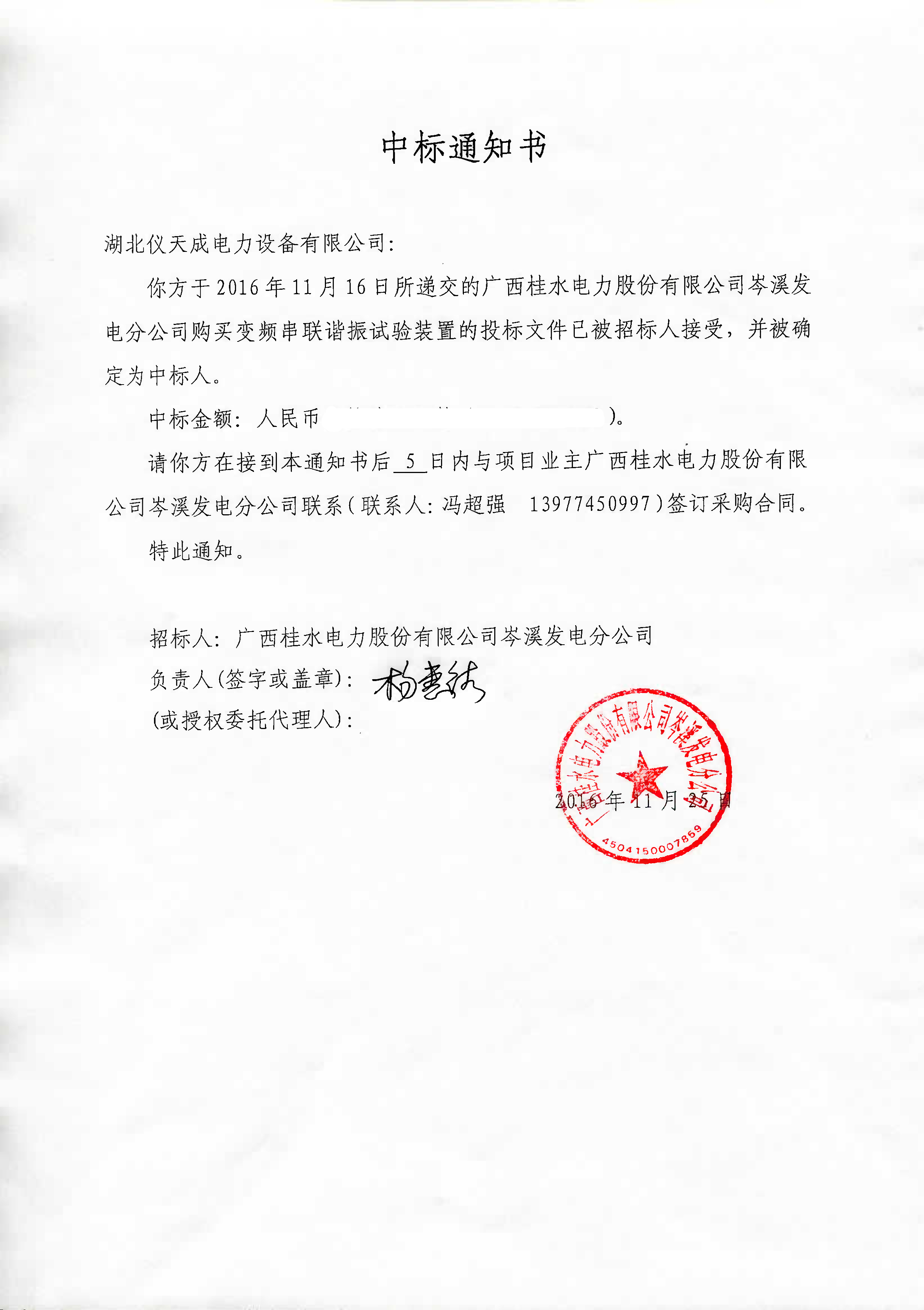 2016年12月,距離2016年結(jié)束不到30天的時間,湖北儀天成銷售部傳來好消息:我公司在廣西桂水電力股份有限公司岑溪發(fā)電分公司的設(shè)備采購招標中,從眾多供應商中脫穎而出,再次中標!