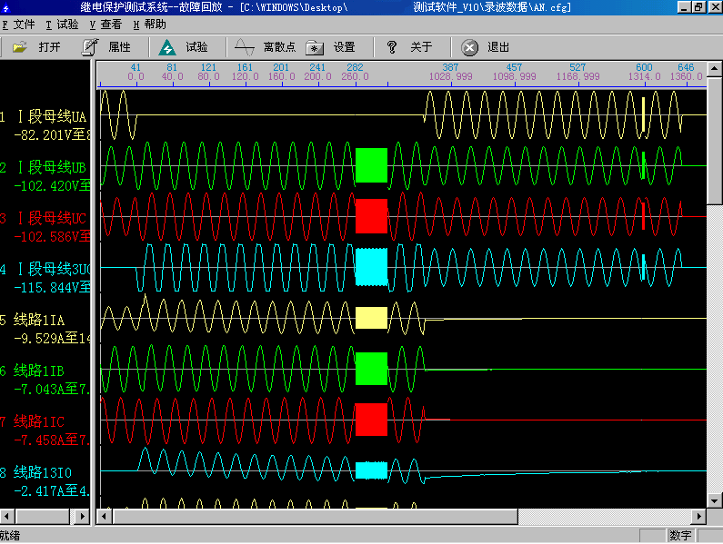 試驗(yàn)前首先打開(kāi)某一個(gè)記錄文件。記錄文件可以放在任何子目錄中,在“打開(kāi)文件”對(duì)話框中查找,找到所在子目錄后程序會(huì)自動(dòng)將所有后綴為.CFG的文件名列出。選定某一文件后程序自動(dòng)將該名字的.CFG和.DAT文件調(diào)入,并將所有電壓電流波形及其通道名稱等顯示在屏幕上。另外還可以通過(guò)工具欄的按鈕查看文件屬性、波形離散采樣點(diǎn)等。