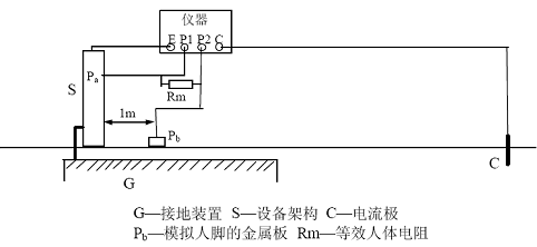 儀器的P1 端子接至設(shè)備架構(gòu)上的Pa 點(diǎn),Pa 距地面高度為1.8 米。儀器的P2 端子接至模擬腳的電極Pb,該電極可采用包裹濕布的直徑為20cm 的金屬圓盤(pán),并壓上重物。電極中心距設(shè)備邊緣距離為1 米。