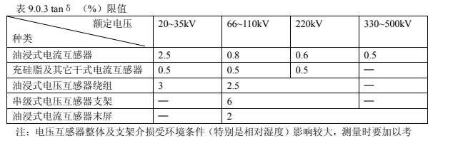 1.互感器的繞組 tanδ測(cè)量電壓應(yīng)在 10kV 測(cè)量,tanδ不應(yīng)大于表 9.0.3 中數(shù)據(jù)。當(dāng)對(duì)絕緣有懷疑時(shí),可采用高壓法進(jìn)行試驗(yàn),在(0.5~1) Um√3 范圍內(nèi)進(jìn)行,tanδ變化量不應(yīng)大于0.2% ,電容變化量不應(yīng)大于0.5%;