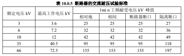 在斷路器合閘及分閘狀態(tài)下進行交流耐壓試驗時:當在合閘狀態(tài)下進行時,試驗電壓應(yīng)符合表 10.0.5 的規(guī)定。當在分閘狀態(tài)下進行時,真空滅弧室斷口間的試驗電壓應(yīng)按產(chǎn)品技術(shù)條件的規(guī)定,試驗中不應(yīng)發(fā)生貫穿性放電。