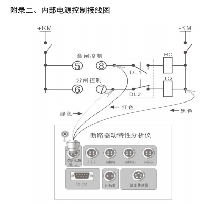 ①分合閘控制電源由儀器內(nèi)部提供時,斷開被測開關(guān)控制箱內(nèi)的控制電源(通常是將控制箱內(nèi)控制電源與控制母線相連的保險撥掉),但不能切斷開關(guān)機(jī)構(gòu)的儲能電源,然后再按附錄二《內(nèi)部電源控制接線圖》接線。