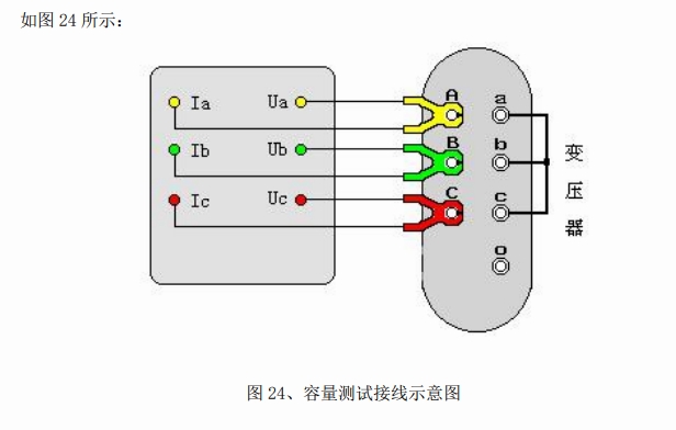 容量測(cè)試儀配有三把測(cè)試鉗(黃、綠、紅),每只鉗子分別引出兩根測(cè)試線,一根粗線、一根細(xì)線,粗線接到儀器面板上容量測(cè)試端子對(duì)應(yīng)顏色的電流端子(Ia、Ib、Ic),細(xì)線接到儀器面板上容量測(cè)試端子對(duì)應(yīng)顏色的電壓端子(Ua、Ub、Uc),將鉗頭按顏色分別夾在被試變壓器的高壓側(cè)各相接線柱上,變壓器的低壓側(cè)要用專(zhuān)用短接線良好短接。