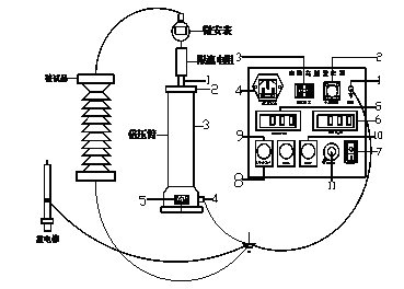 2.將機箱、倍壓筒放置到合適位置分別聯(lián)接好電源線、電纜線和接地線,保護接地線與工作接地線以及放電棒的接地線均應(yīng)單獨接到試品的地線上(即一點接地)。嚴禁各接地線相互串聯(lián)。為此,應(yīng)使用DHV專用接地線。