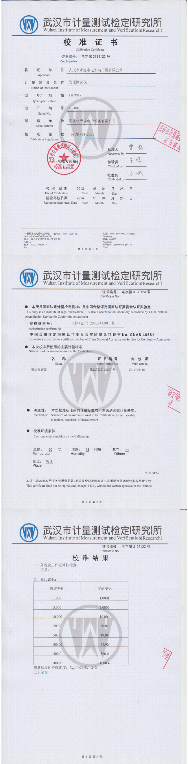 YTC3317全自動(dòng)變比組別測(cè)試儀資質(zhì)證書(shū)