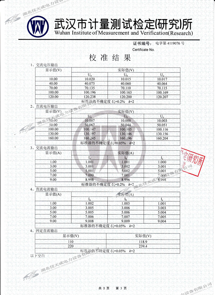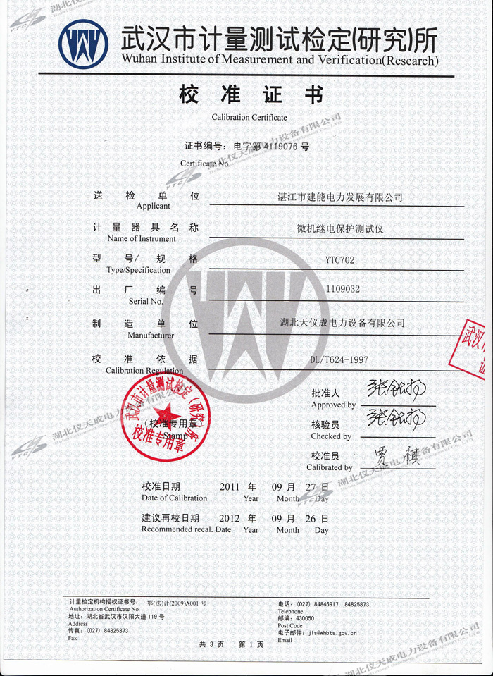 YTC702微機(jī)繼電保護(hù)測試儀的資質(zhì)證書