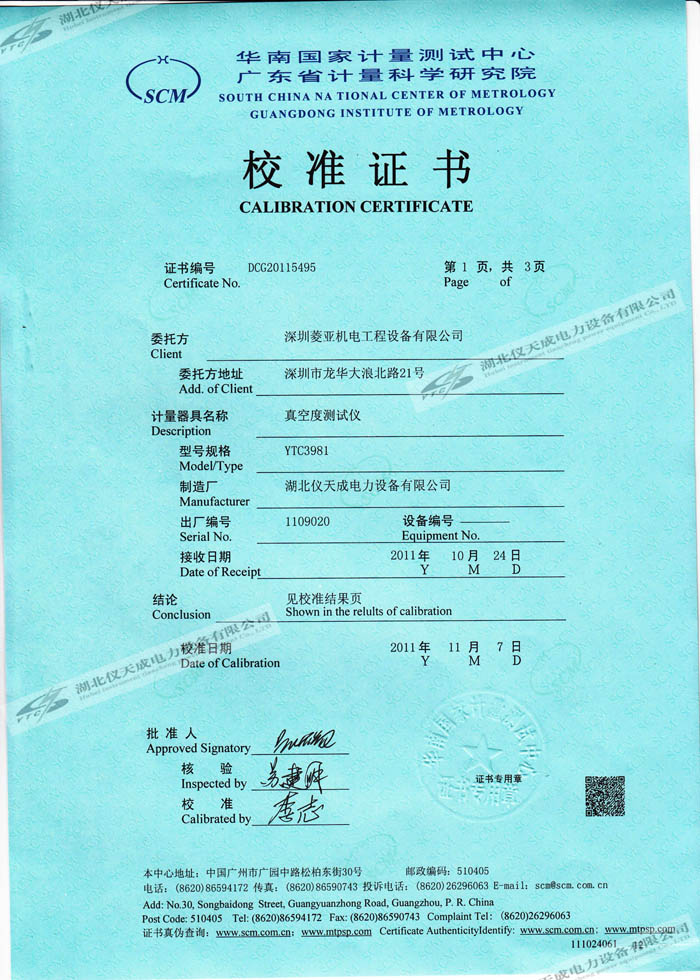 轉(zhuǎn)載:"YTC3981真空度測試儀的資質(zhì)證書" 請注明來源于儀天成電力。 更多技術(shù)問題請致電儀天成電力客戶服務(wù):027-87876585,技術(shù)部專線:027-87876585,在線客服:719388481