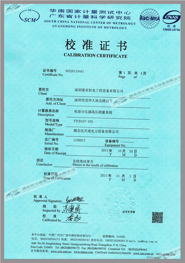 轉(zhuǎn)載:"YTC8107系列電容分壓器高壓測(cè)量系統(tǒng)鑒定證書" 請(qǐng)注明來(lái)源于儀天成電力。 更多技術(shù)問題請(qǐng)致電儀天成電力客戶服務(wù):027-87876585,技術(shù)部專線:027-87876585,在線客服: